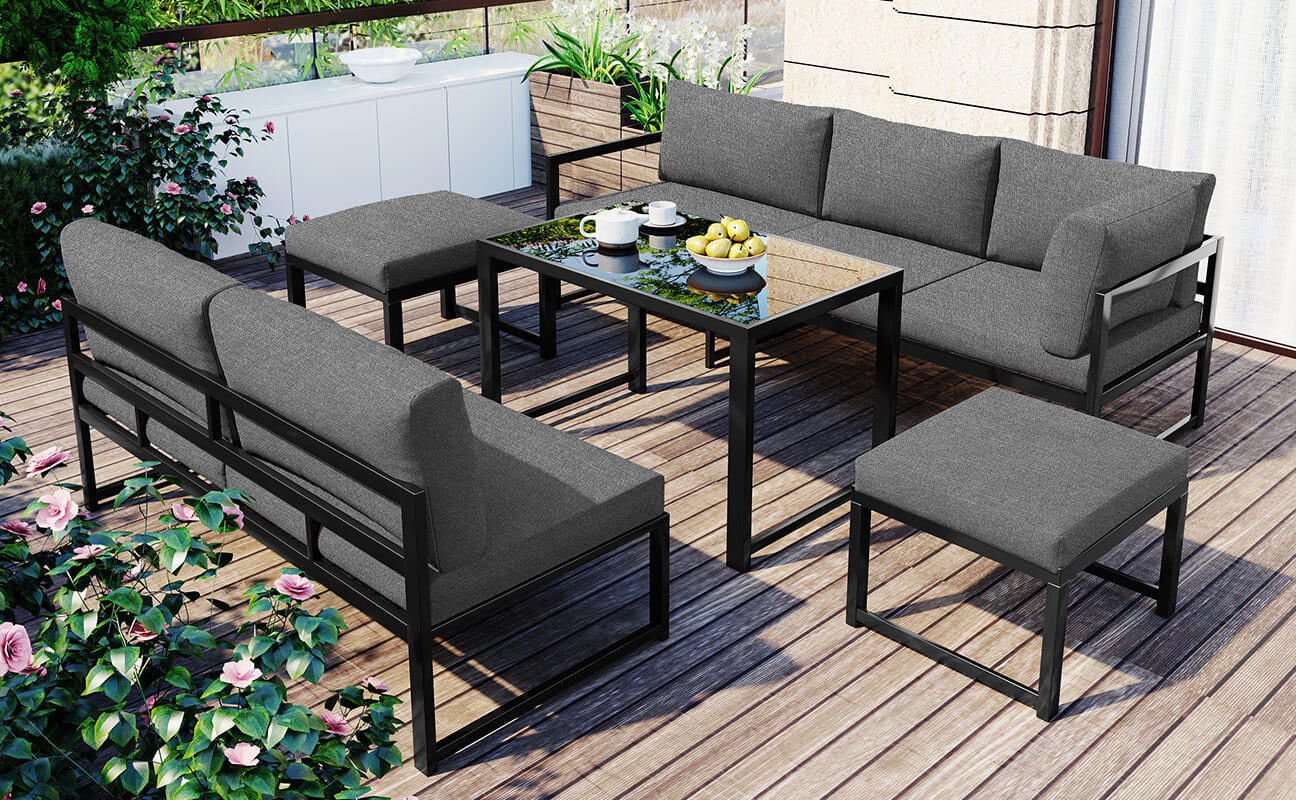 - Conjunto de 6-7 plazas con sofá, sillones y mesa: desde 400-800 € (modelos en aluminio y textilene resistentes al agua).