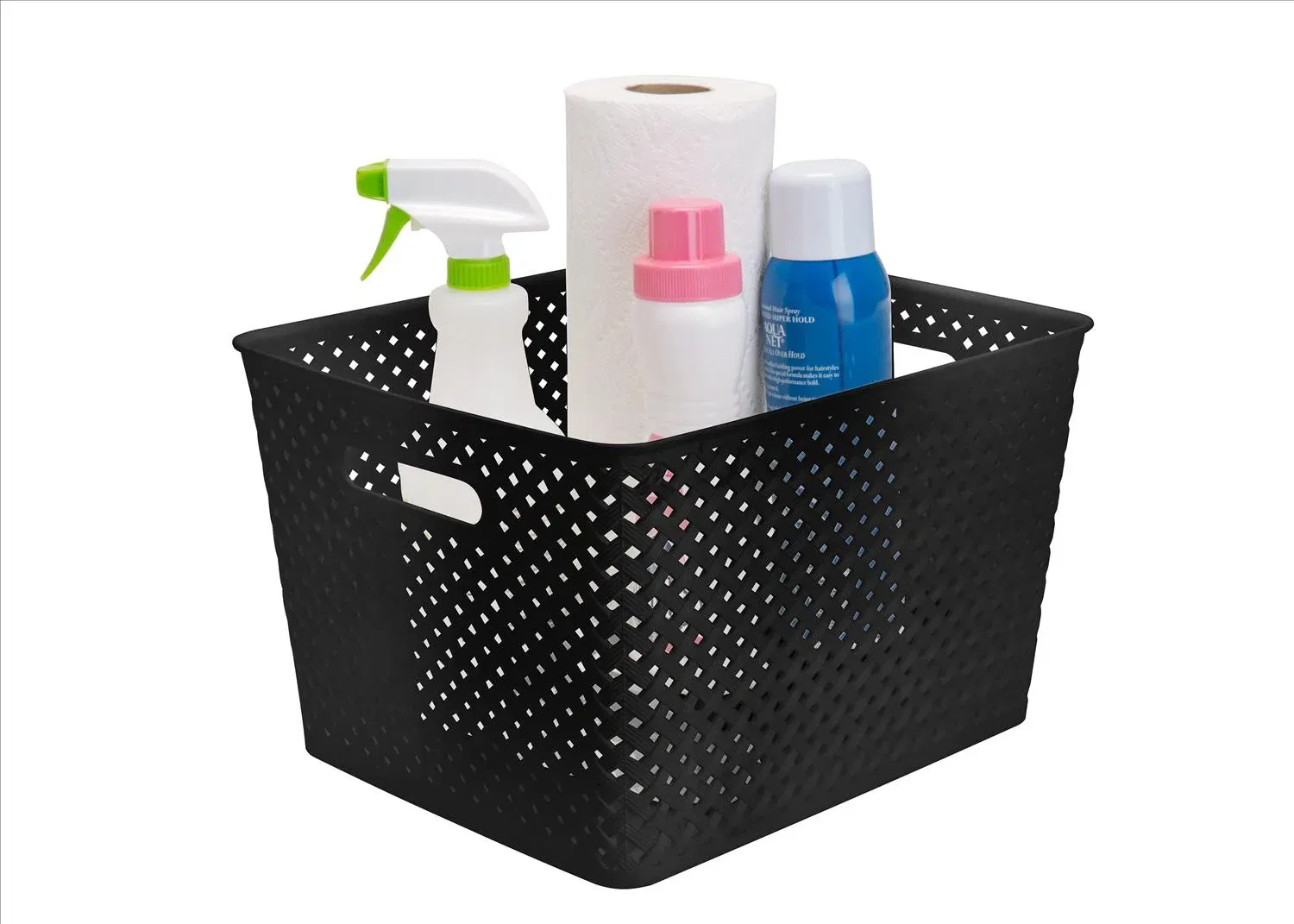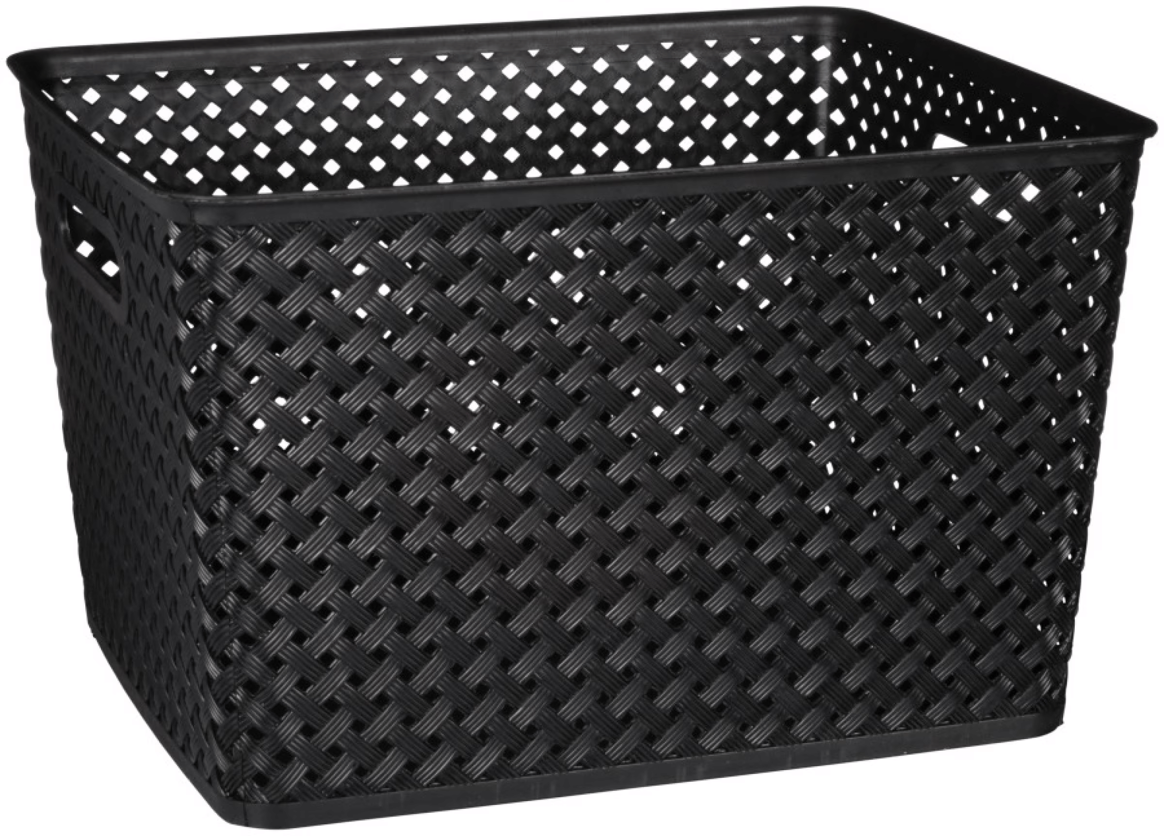 - Large Open-Top Storage Bin (black resin wicker look): $15–$25.