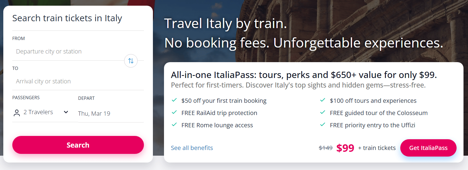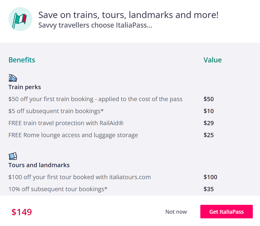 | ItaliaPass bundle | $50 + $650+ en perks | Comprar con ticket de tren | Sí (limited) |