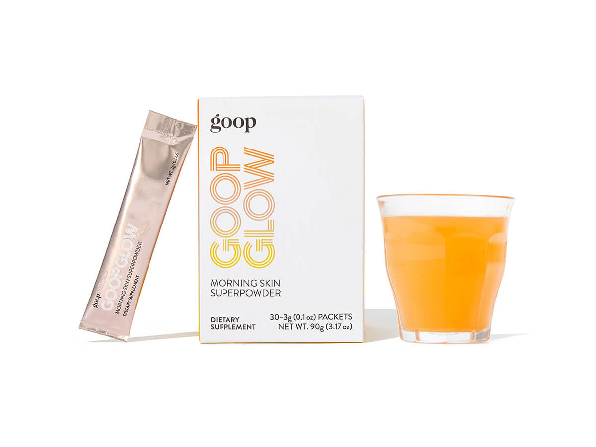 - GOOPGLOW Morning Skin Superpowder Antioxidant-rich morning drink mix (mix in water or smoothie) with vitamins C & E, grape seed, and more for skin brightness and daily defense. 30 single-serve packets. Price: $60. Delicious and photogenic ritual.